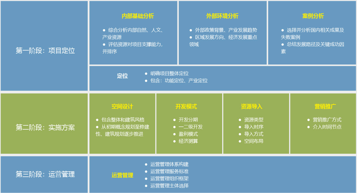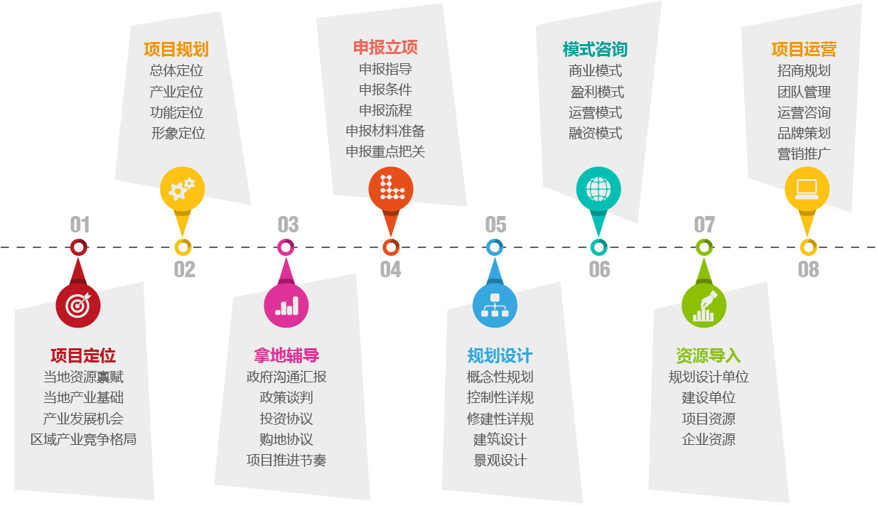 我們提供“產(chǎn)業(yè)定位+項(xiàng)目策劃+拿地輔導(dǎo)+申報(bào)立項(xiàng)+規(guī)劃設(shè)計(jì)+模式設(shè)計(jì)+資源導(dǎo)入+項(xiàng)目運(yùn)營(yíng)”全流程服務(wù)。